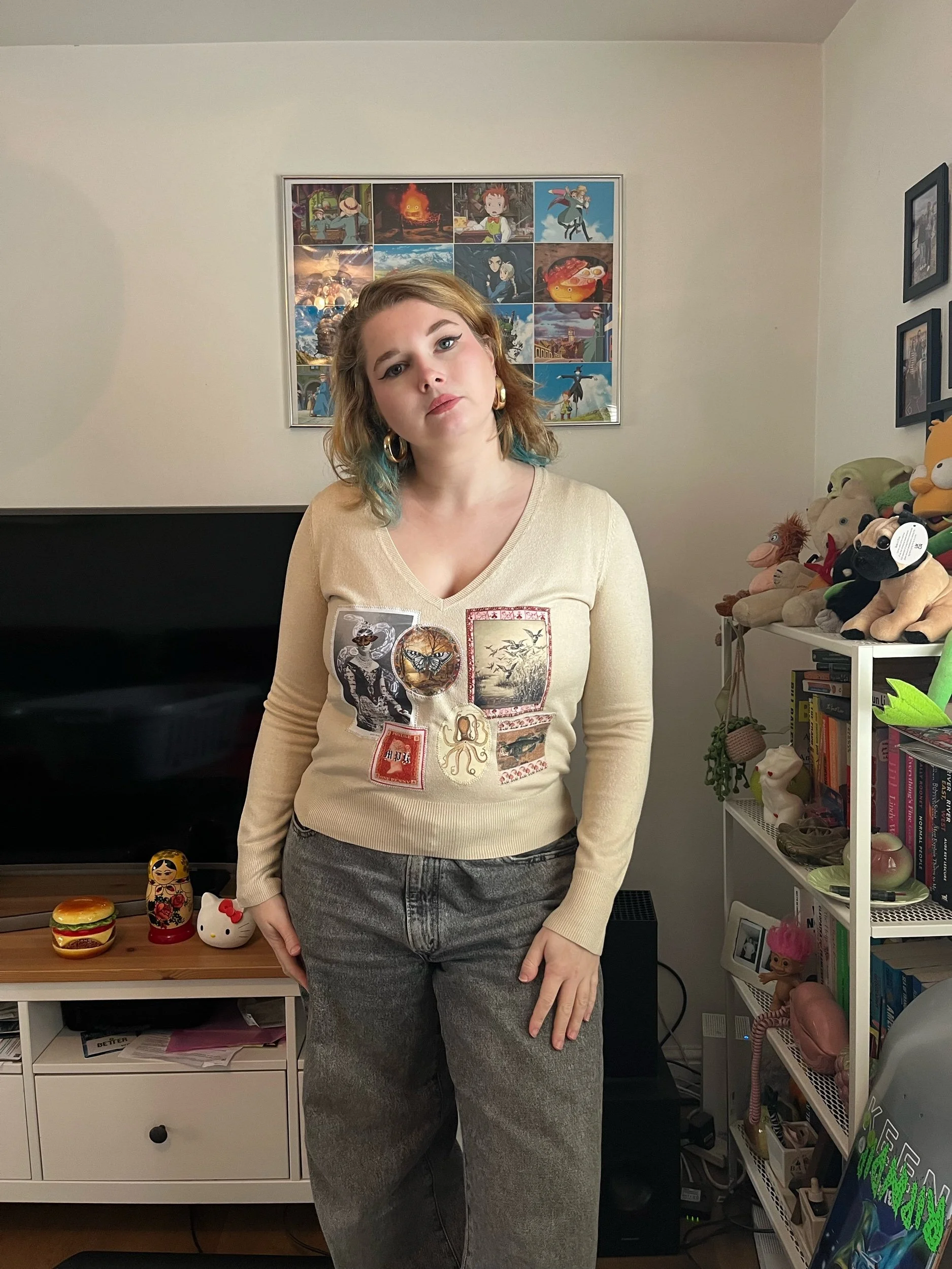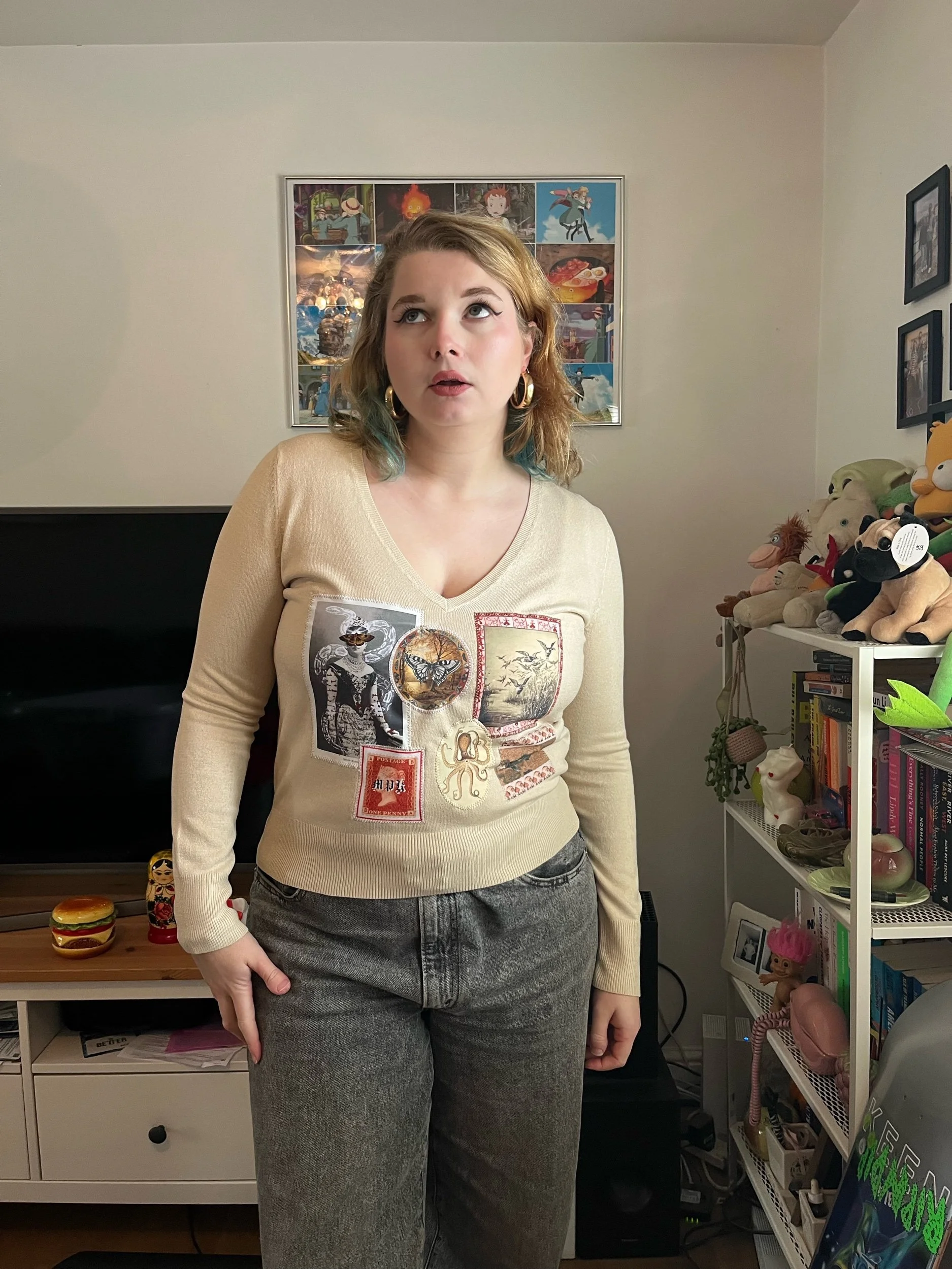 Made from a reworked jumper and patches featuring original prints. Made from a mixture of polyester and stretch lycra.