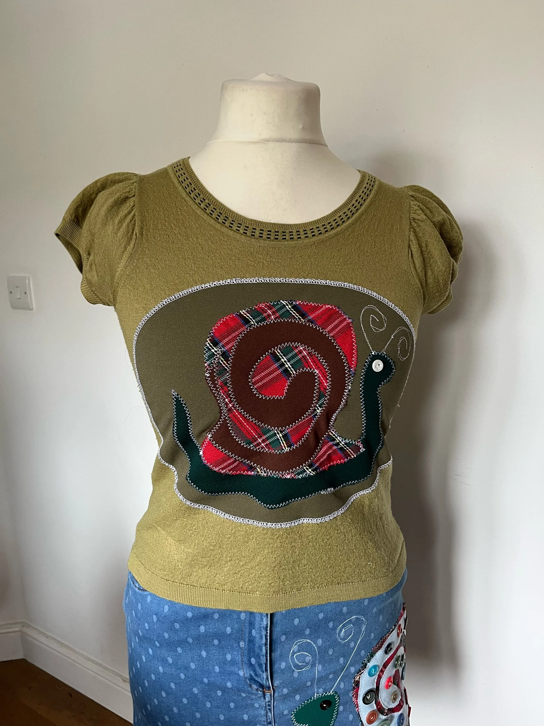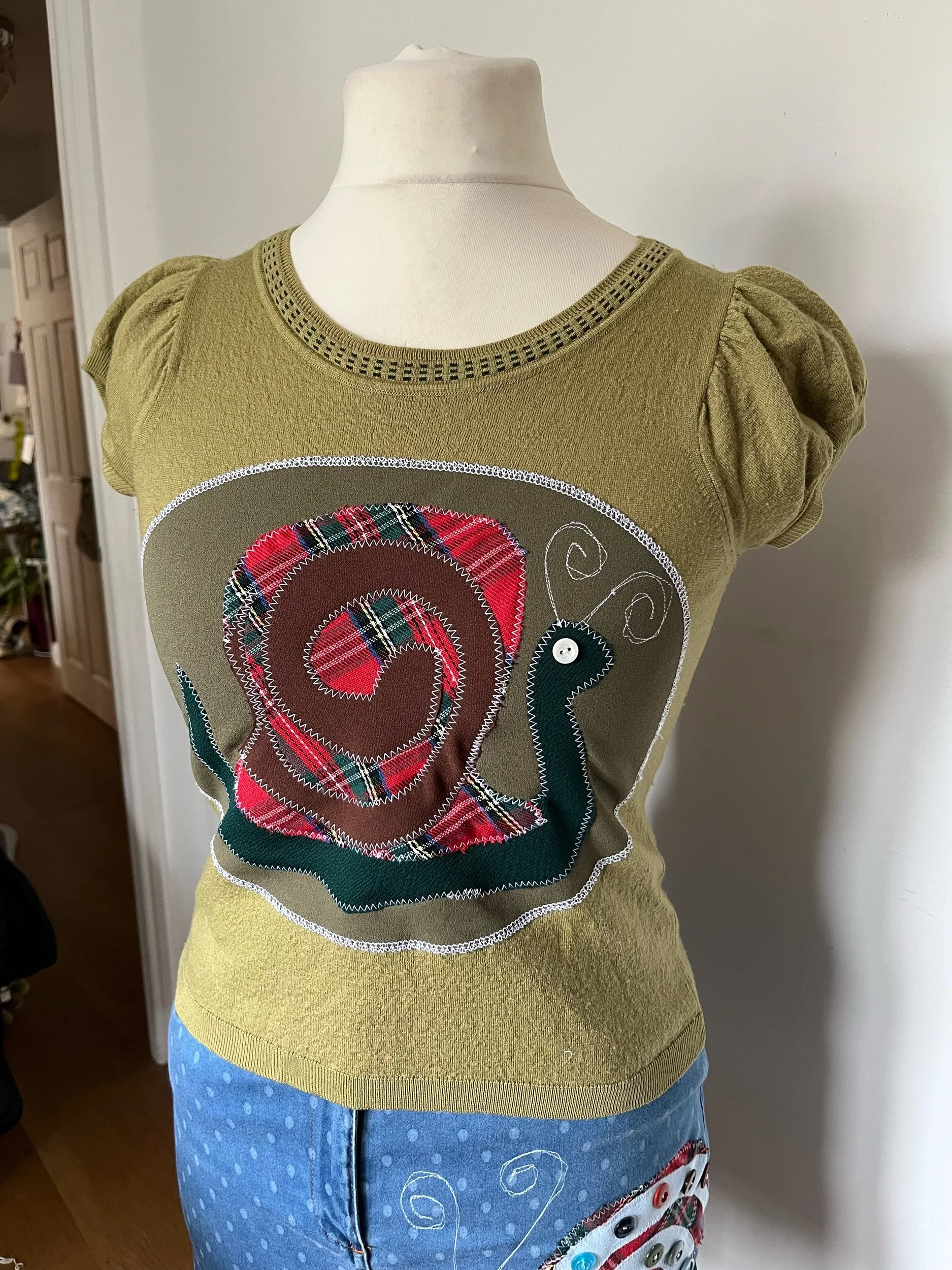 Made from a reworked tee, the snail motif is constructed from scrap fabrics. Made from a mixture of wool and stretch lycra.