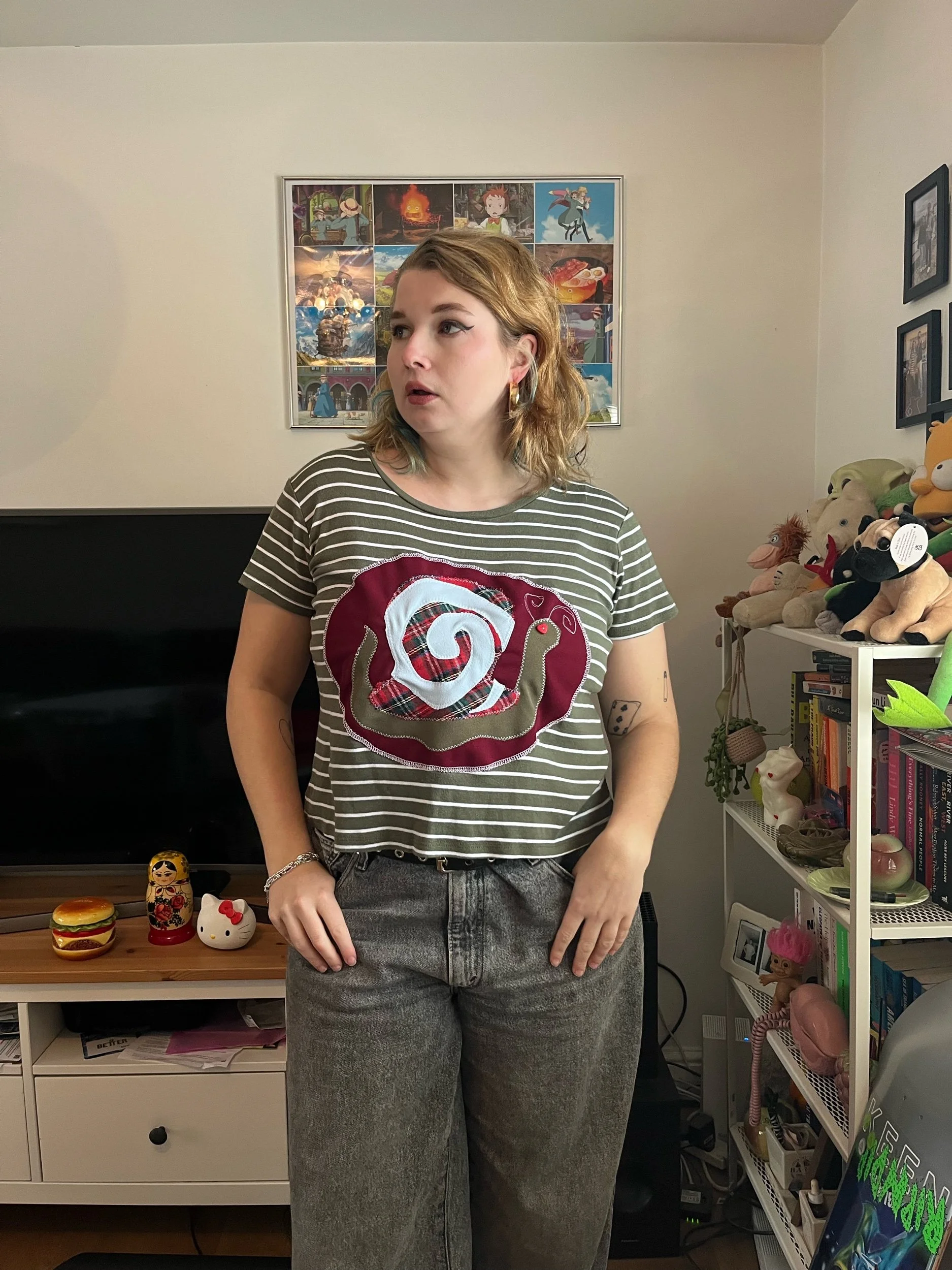Made from a reworked tee, the snail motif is constructed from scrap fabrics. Made from a mixture of cotton and stretch lycra.