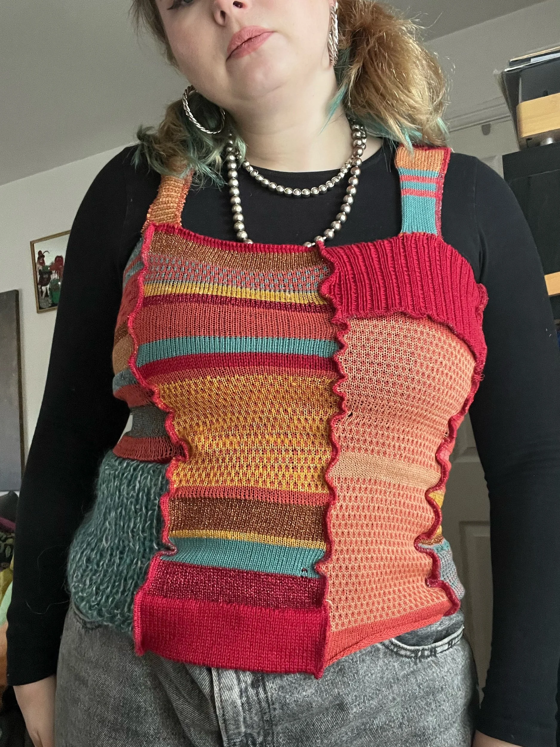 This cami is completely one of a kind, made from knitwear samples I have produced over the years. This top is made from a range of different fibres- so will need to be hand-washed. It can be worn either way, and is perfect for layering over basic items or wearing on its own. Some of the knitted pieces aren’t perfect, which gives this piece its own character.