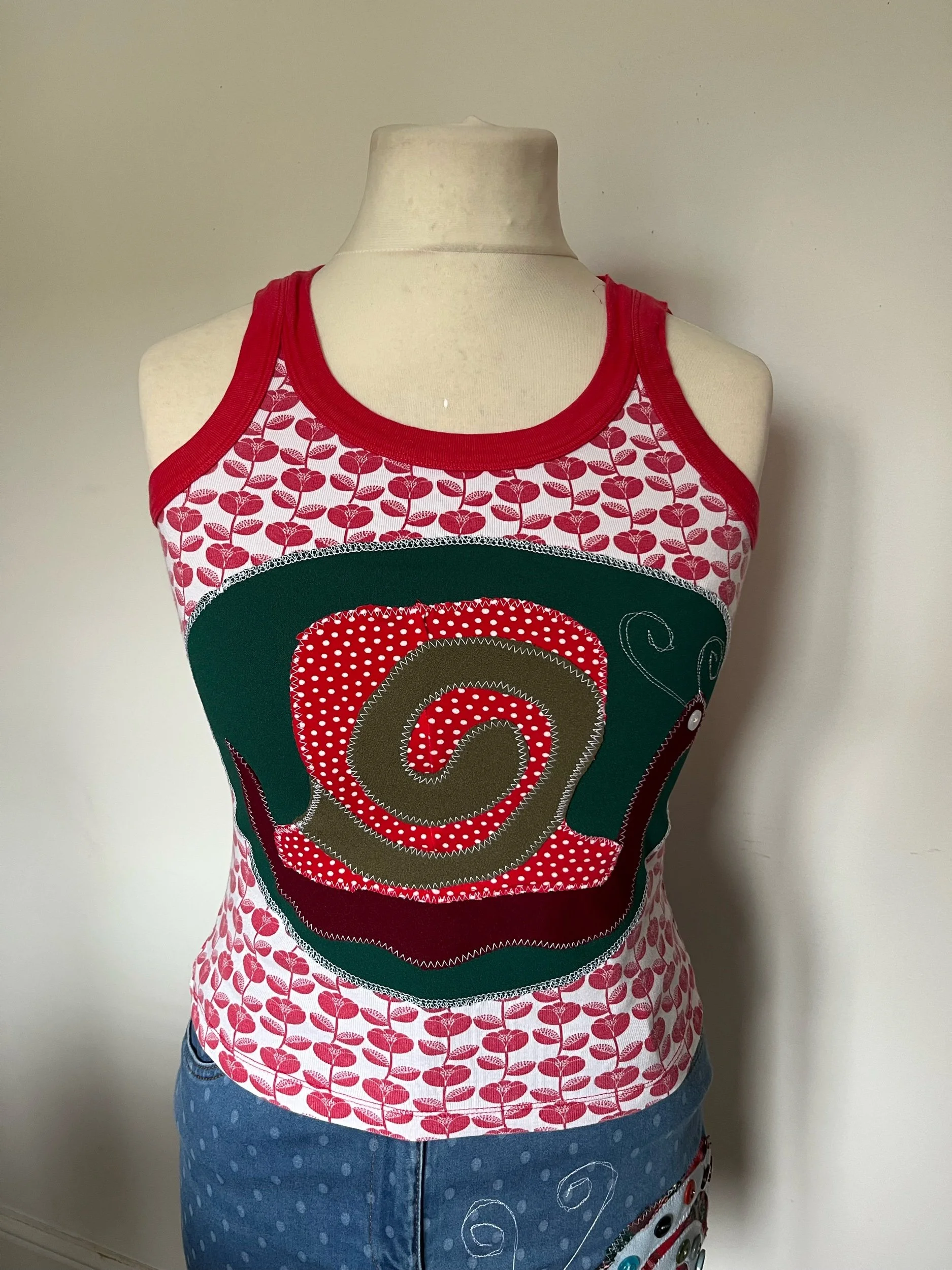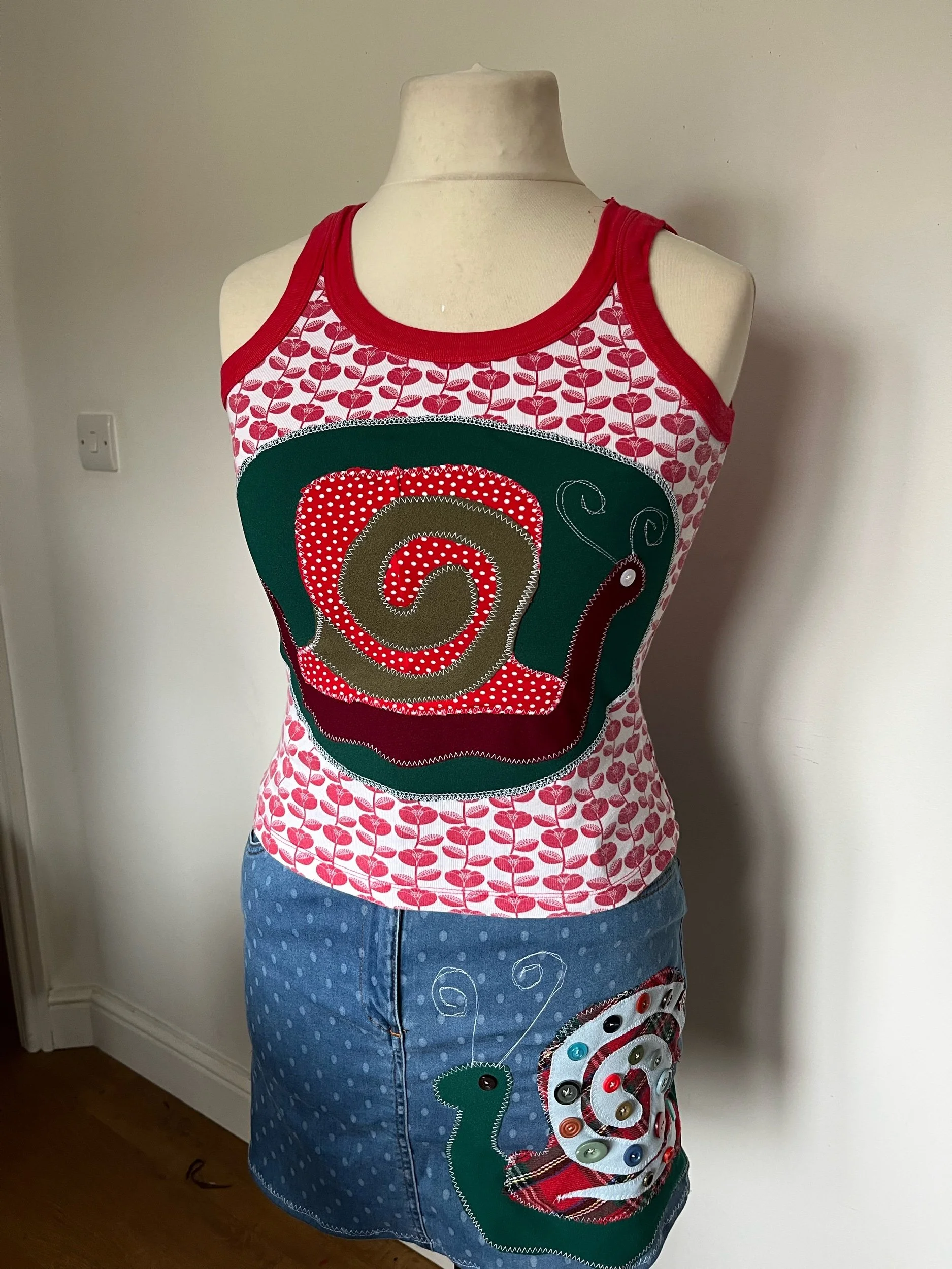 Made from a reworked tank, the snail motif is constructed from scrap fabrics. Made from a mixture of cotton and stretch lycra.