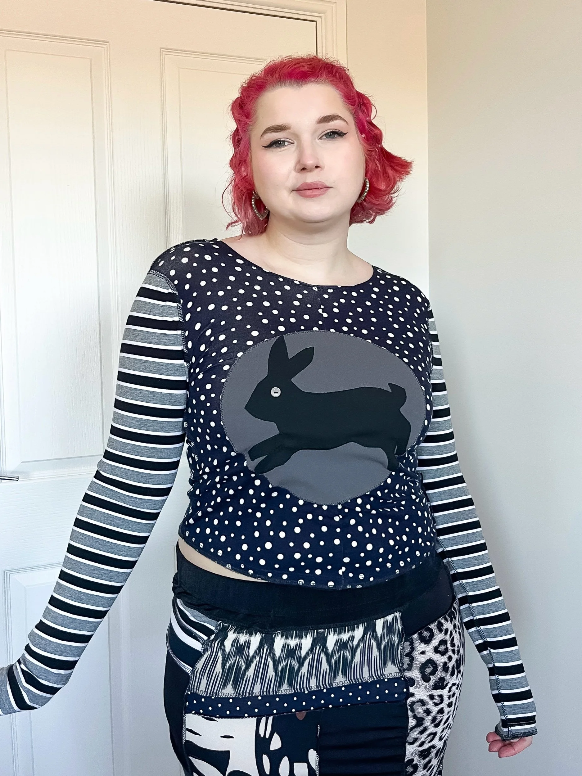 This top is a constructed using reworked clothing and scrap fabrics. Made from a mixture of stretch polyester and stretch lycra.