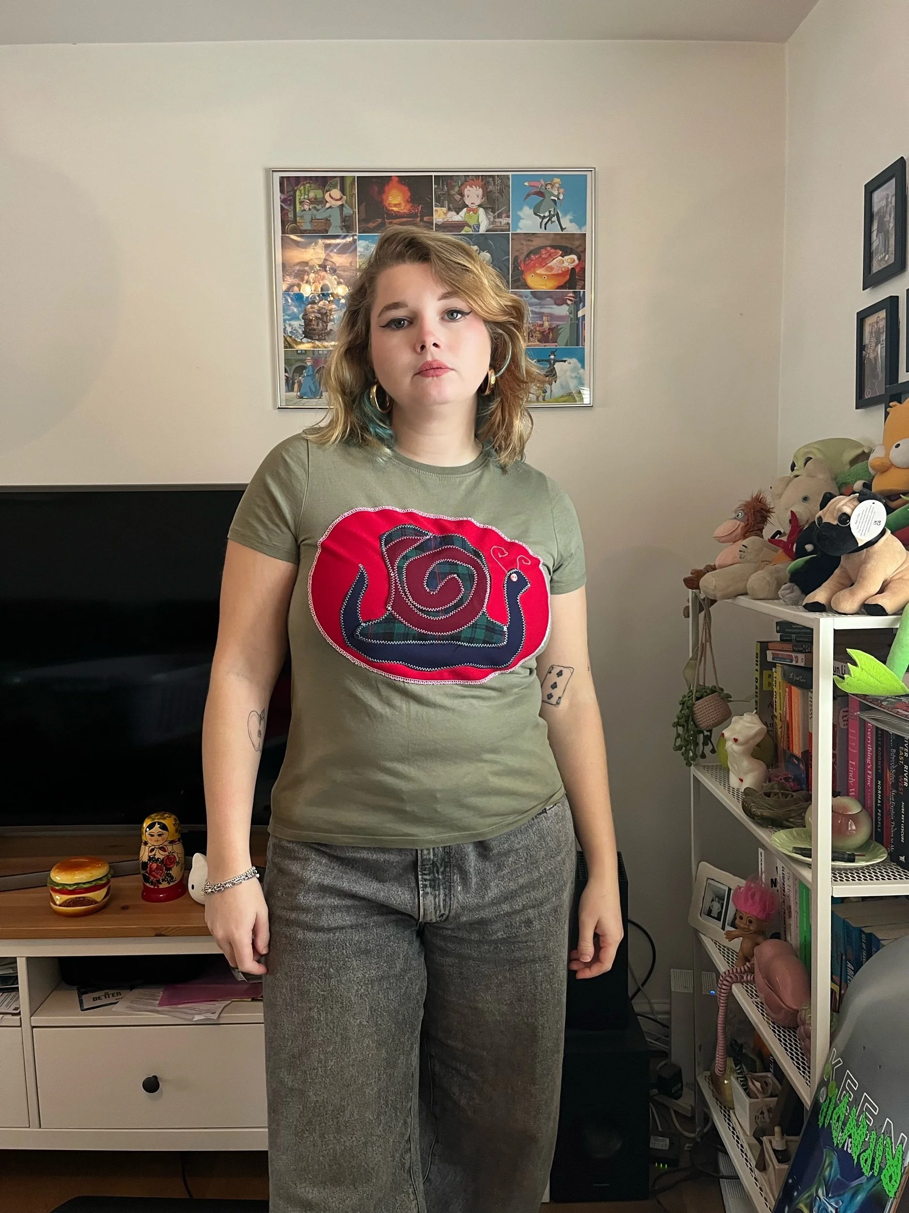 Made from a reworked tee, the snail motif is constructed from scrap fabrics. Made from a mixture of cotton and stretch lycra.