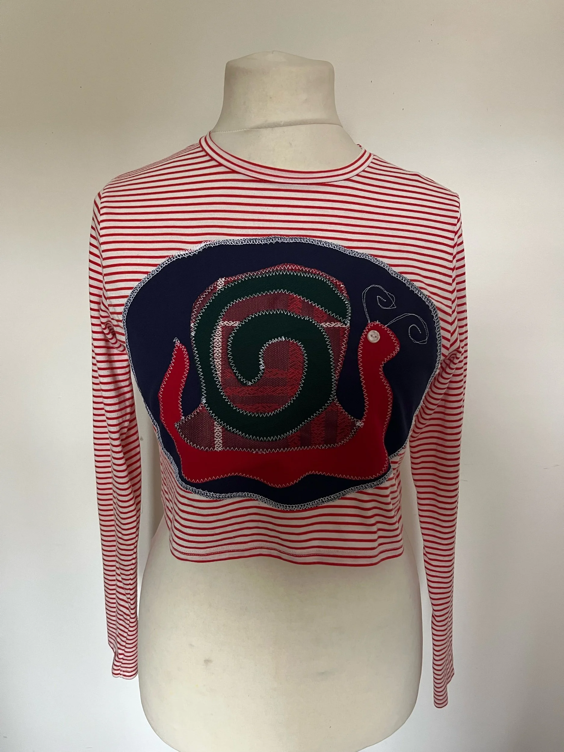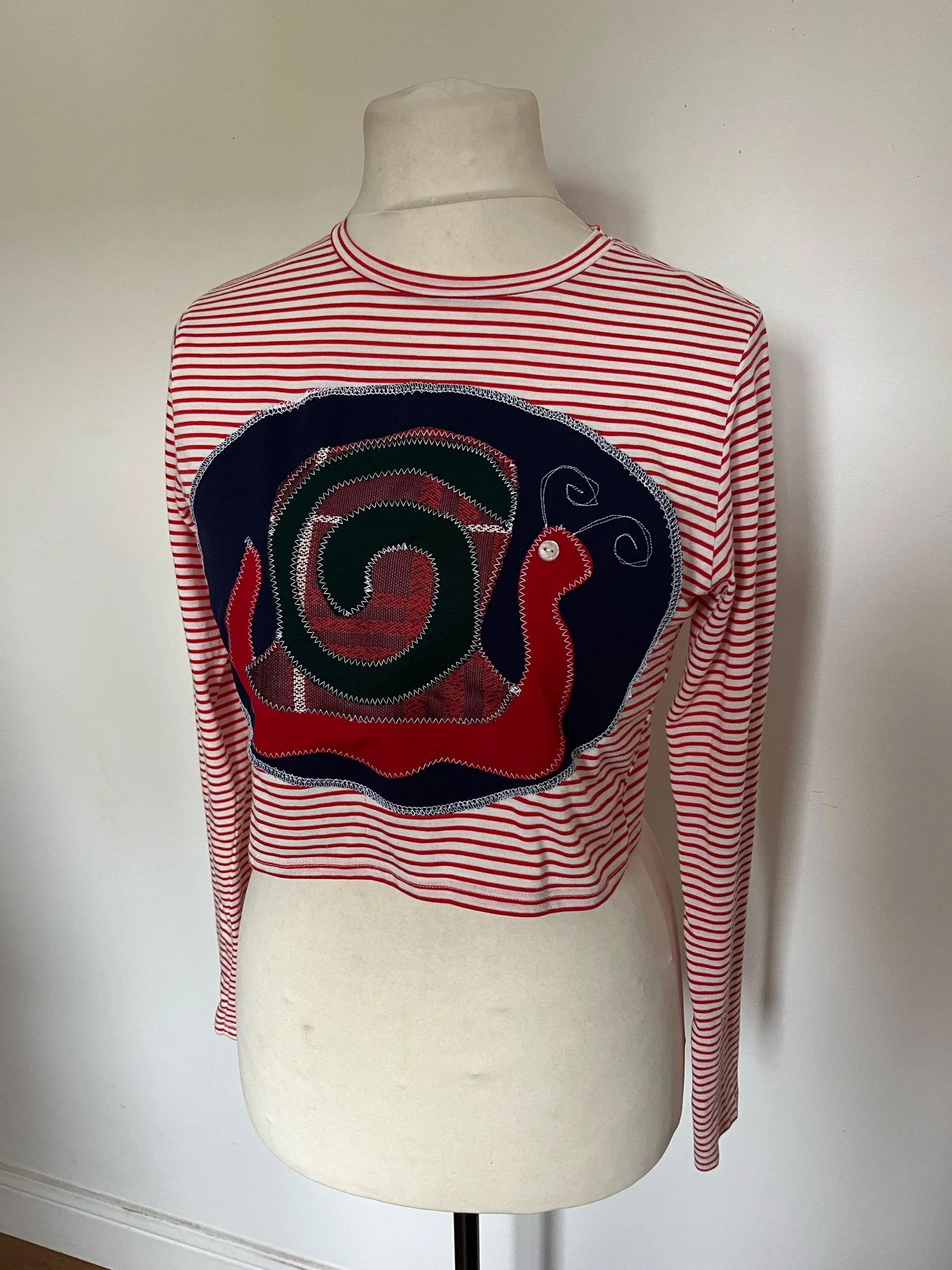 Made from a reworked long sleeve, the snail motif is constructed from scrap fabrics. Made from a mixture of cotton and stretch lycra.