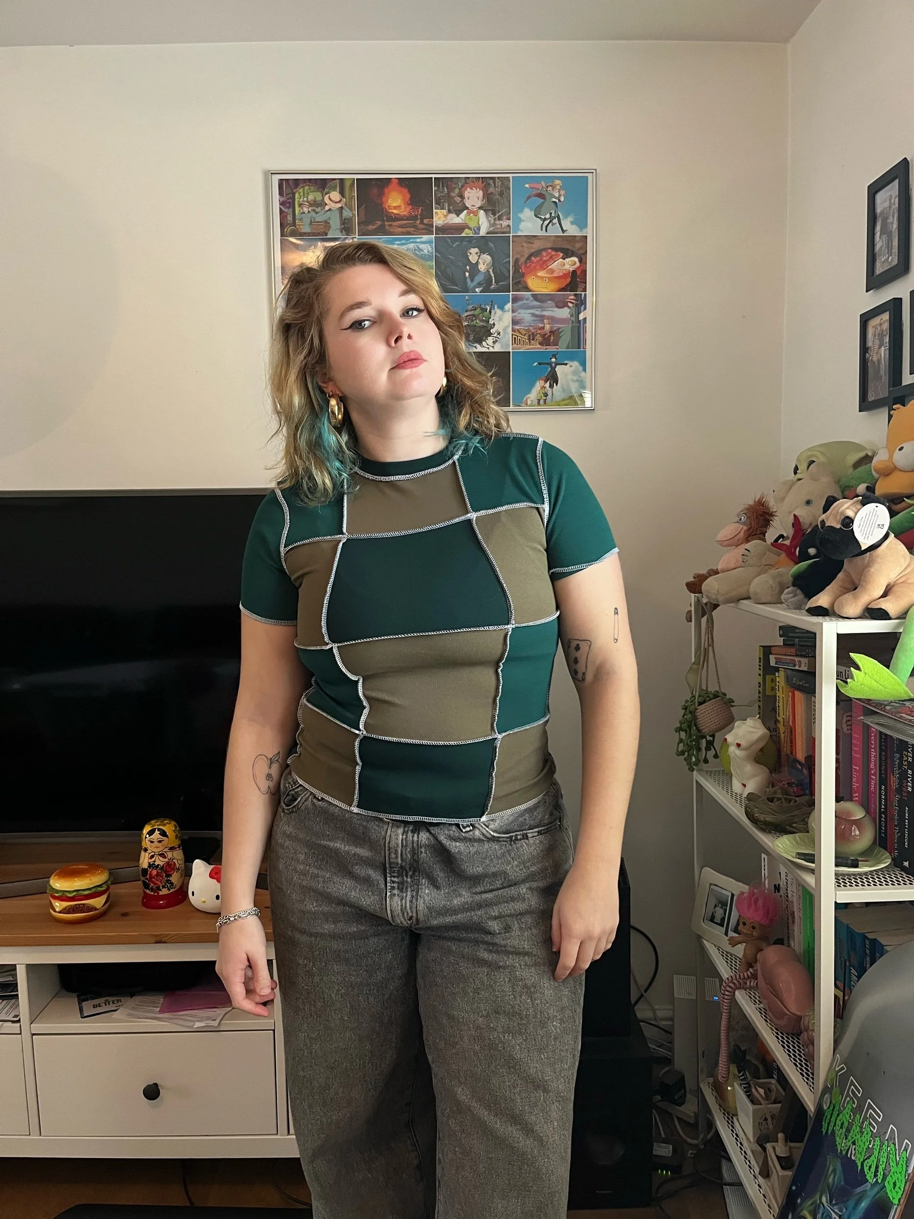 This top is a constructed using remnant materials and scrap fabrics. Made from stretch scuba crepe.