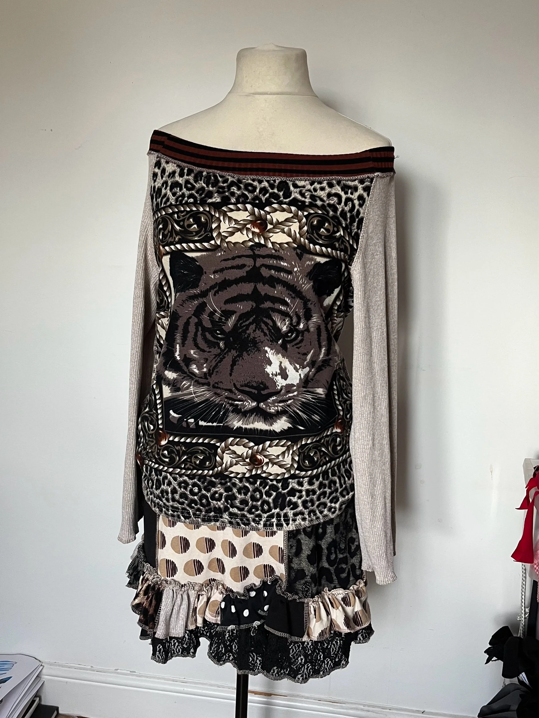 This top is a constructed using reworked clothing and scrap fabrics. Made from a mixture of stretch polyester and stretch lycra.