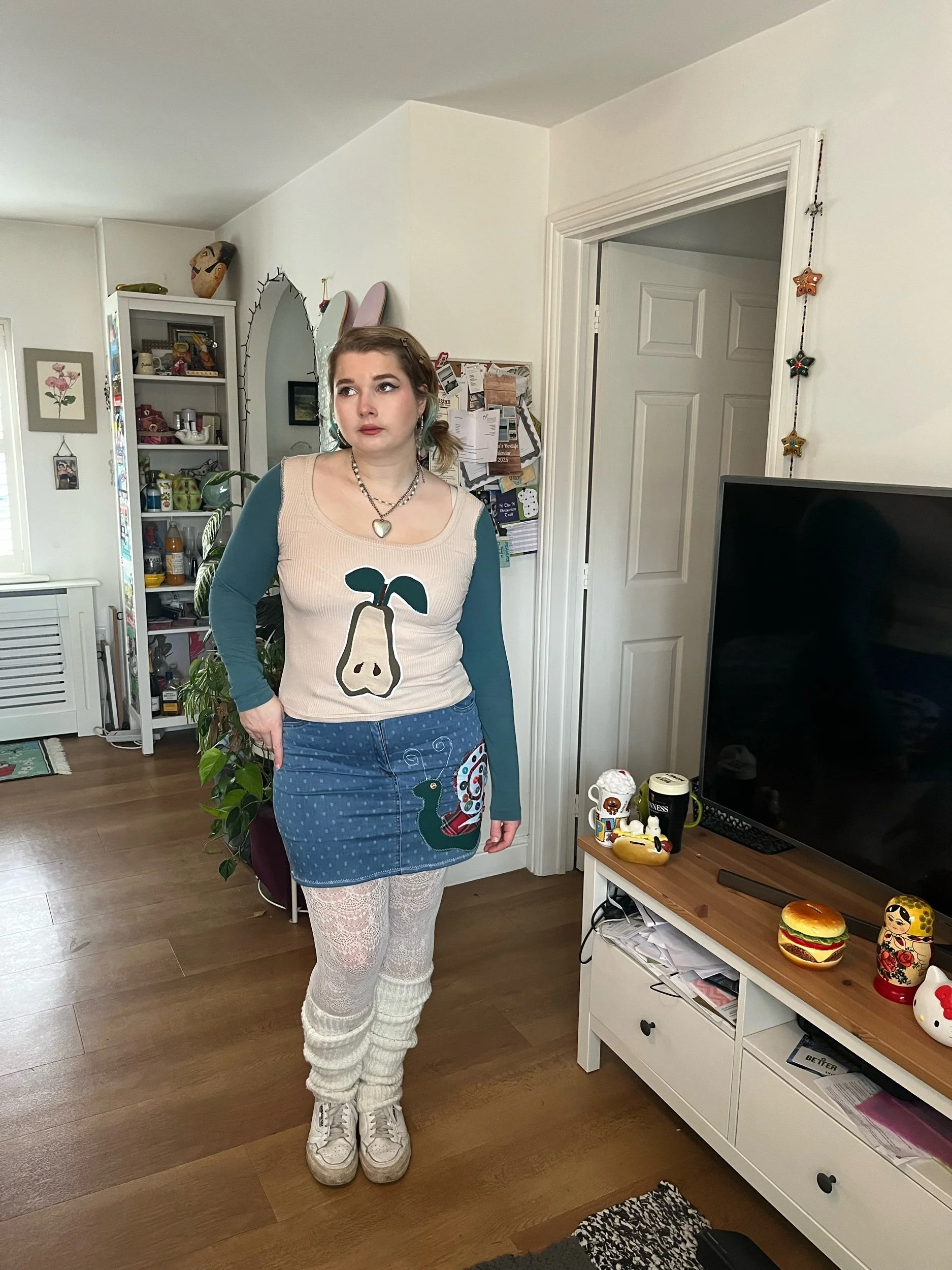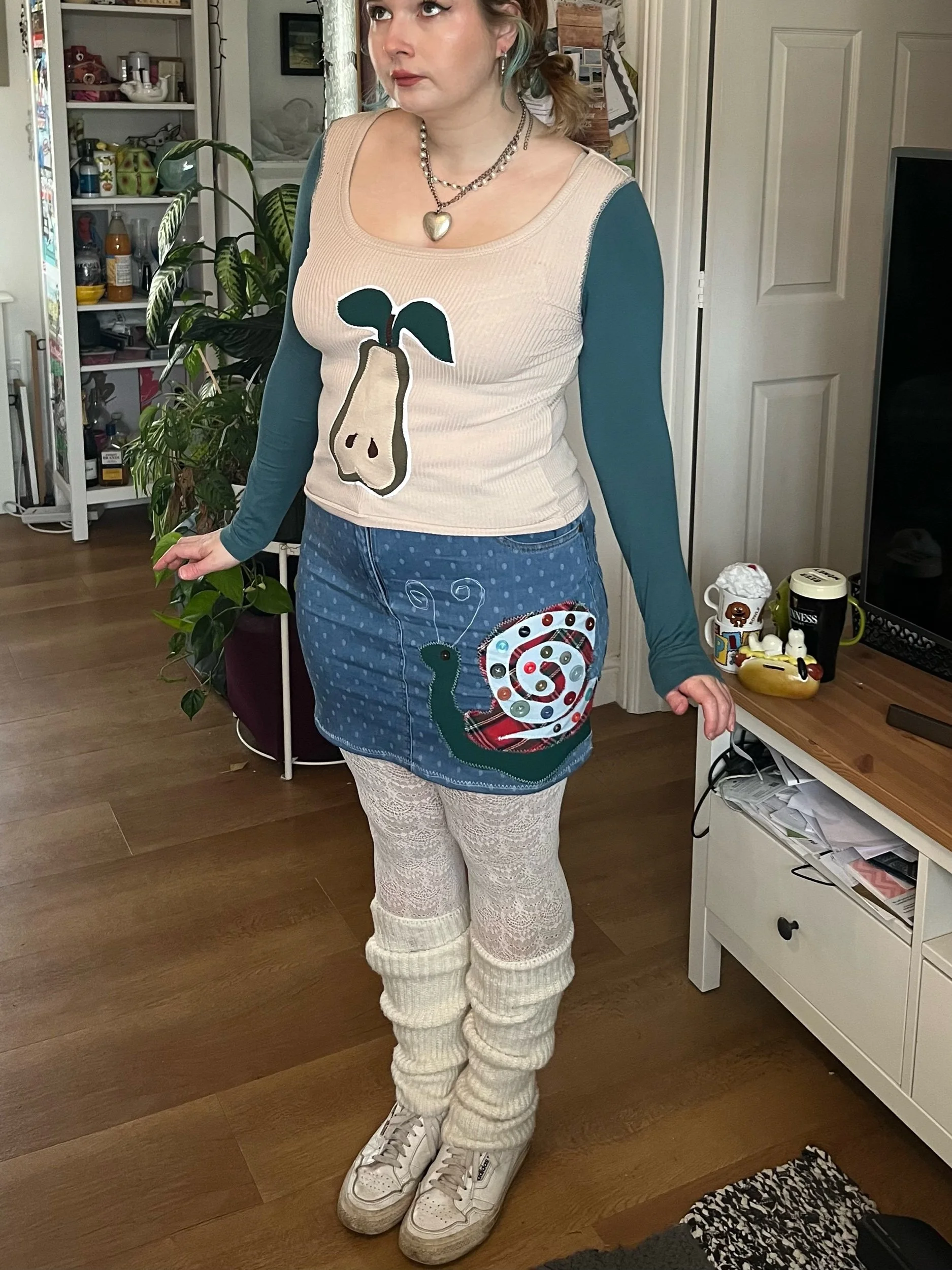 Made from a reworked skirt, the snail motif is constructed from scrap fabrics. Made from a mixture of cotton and stretch lycra.