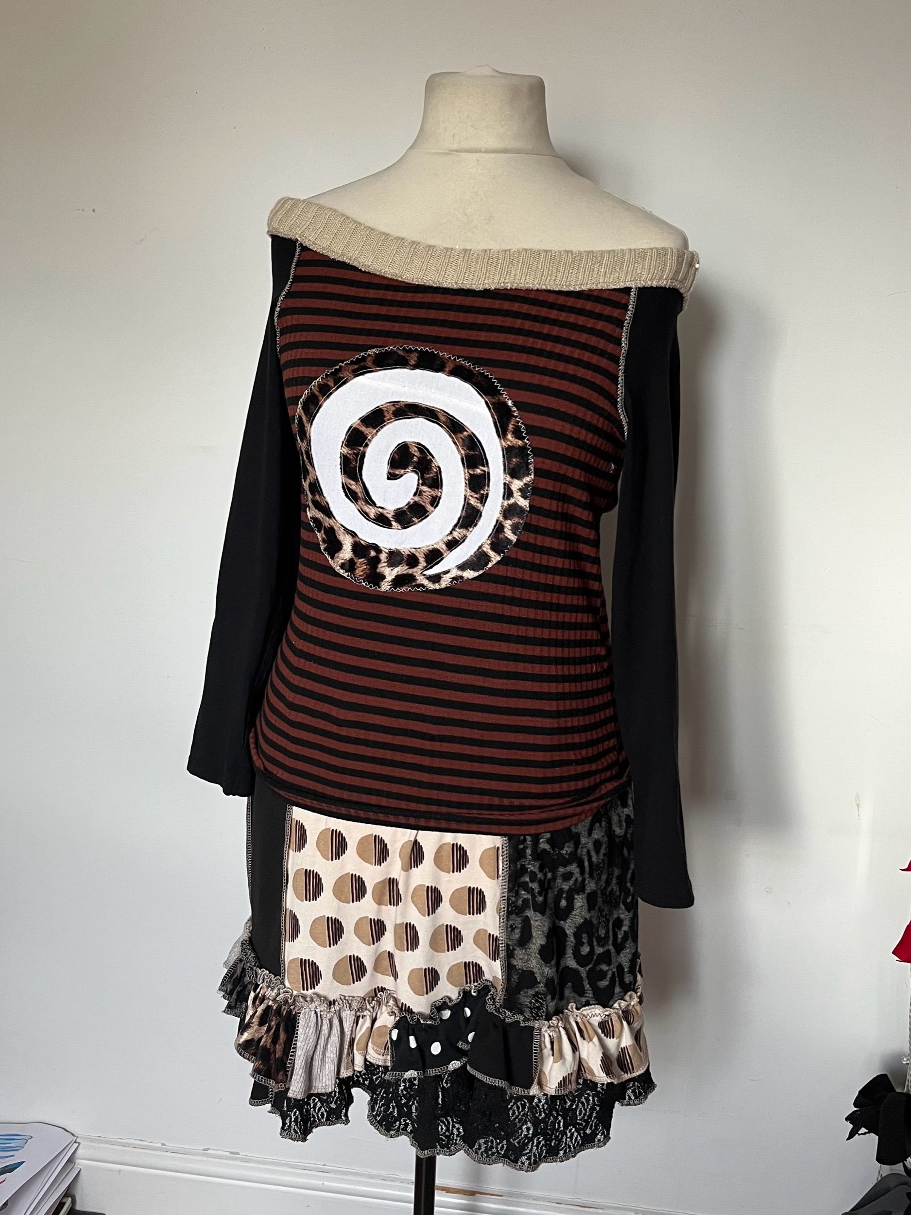 This top is a constructed using reworked clothing and scrap fabrics. Made from a mixture of stretch cotton, polyester and stretch lycra.