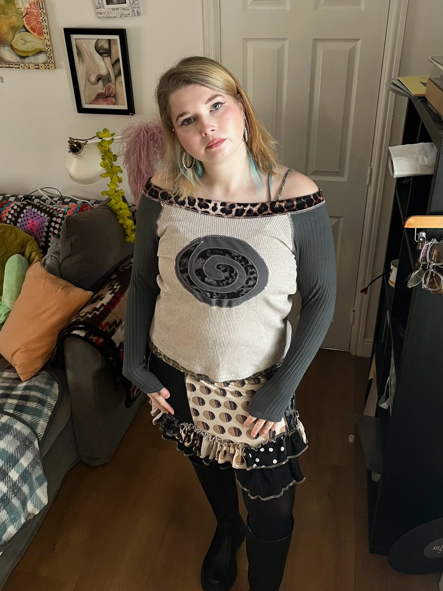 This top is a constructed using reworked clothing and scrap fabrics. Made from a mixture of stretch polyester and stretch lycra.
