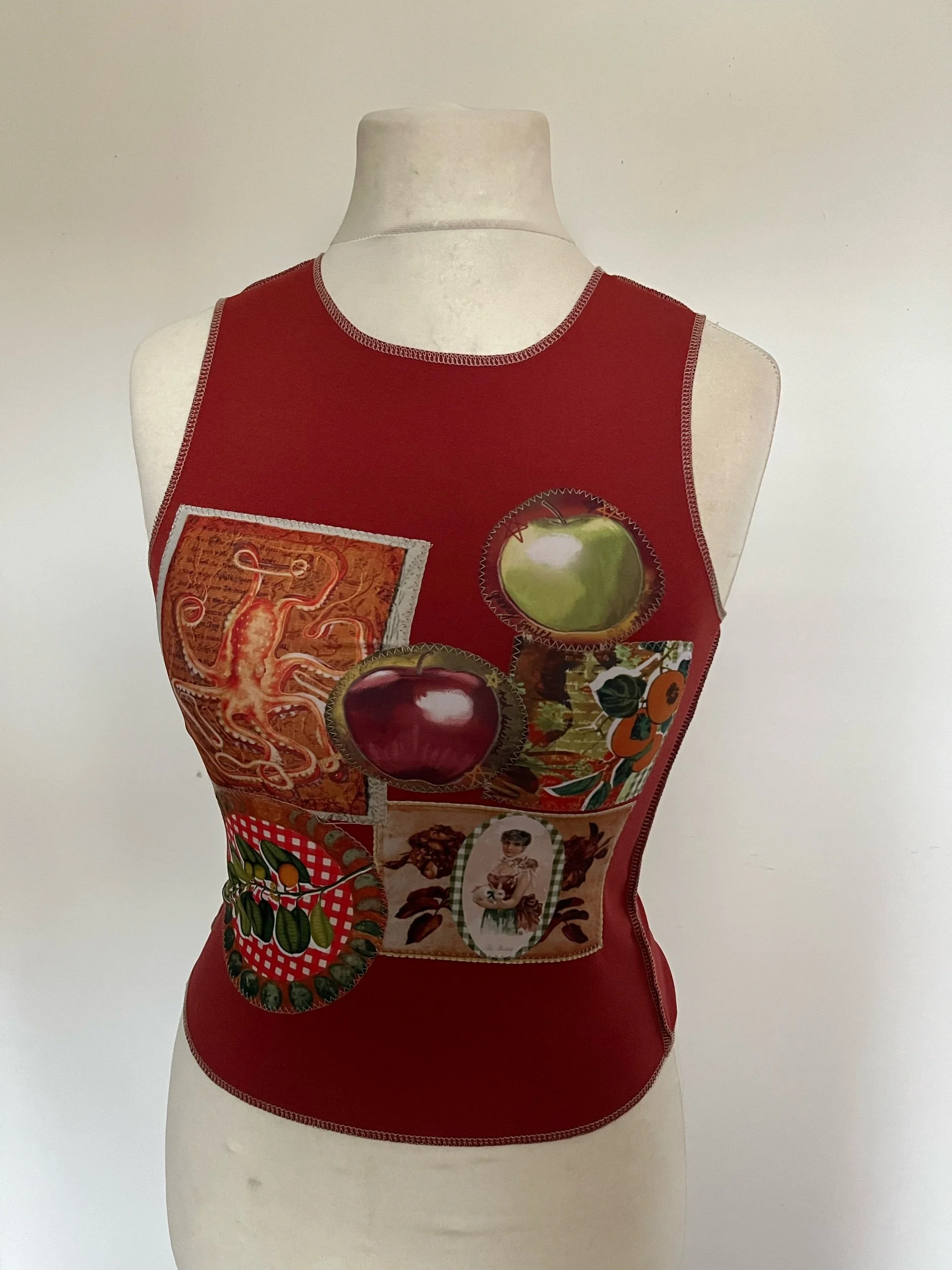 Made from a remnant fabric and patches featuring original prints. Made from a mixture of polyester and stretch lycra.