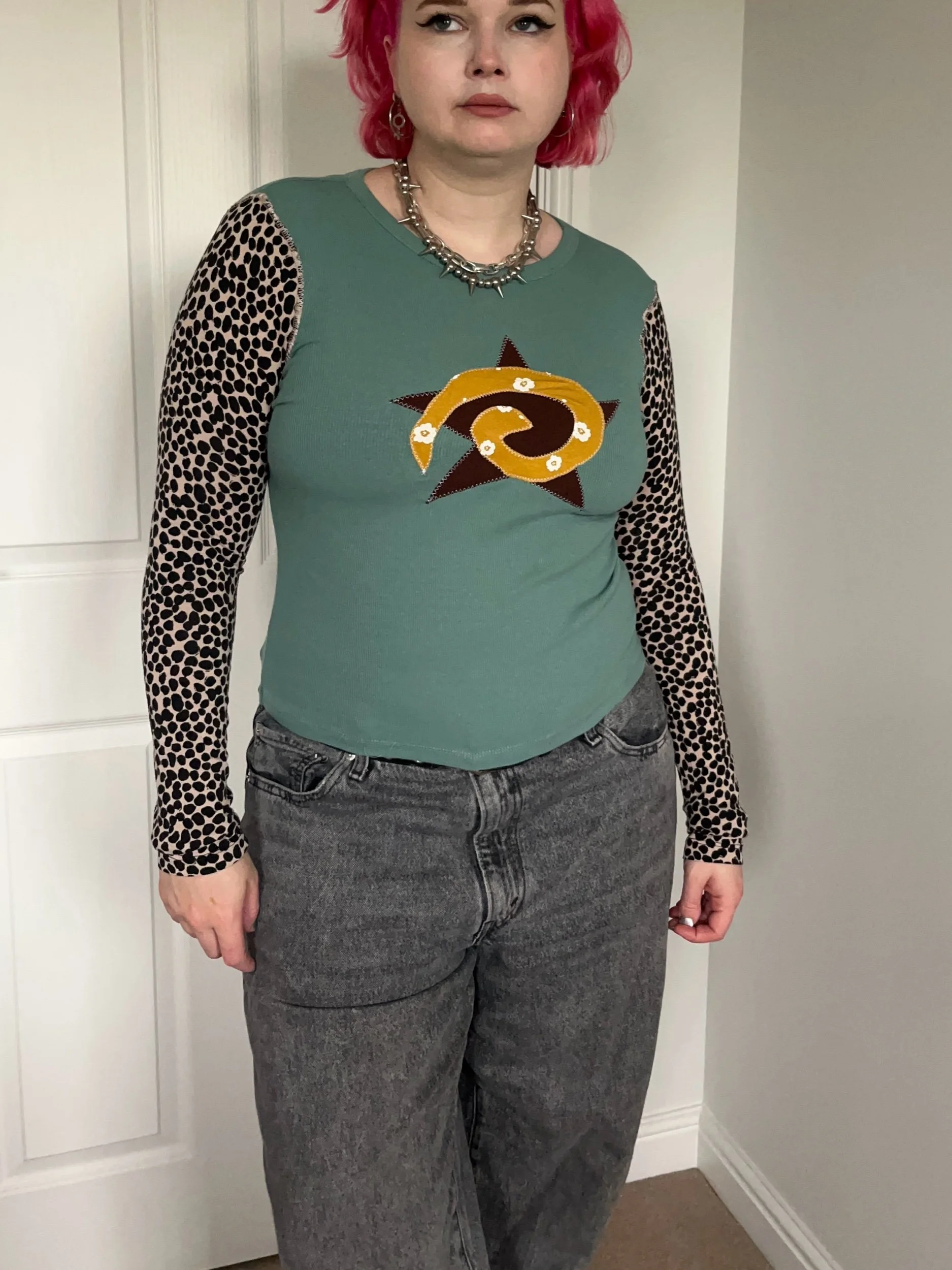 This top is a constructed using reworked clothing and scrap fabrics. Made from a mixture of stretch cotton and stretch lycra.