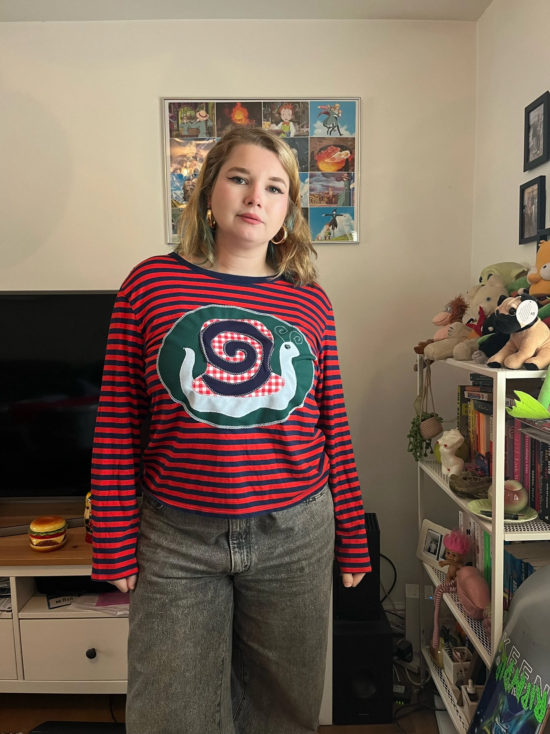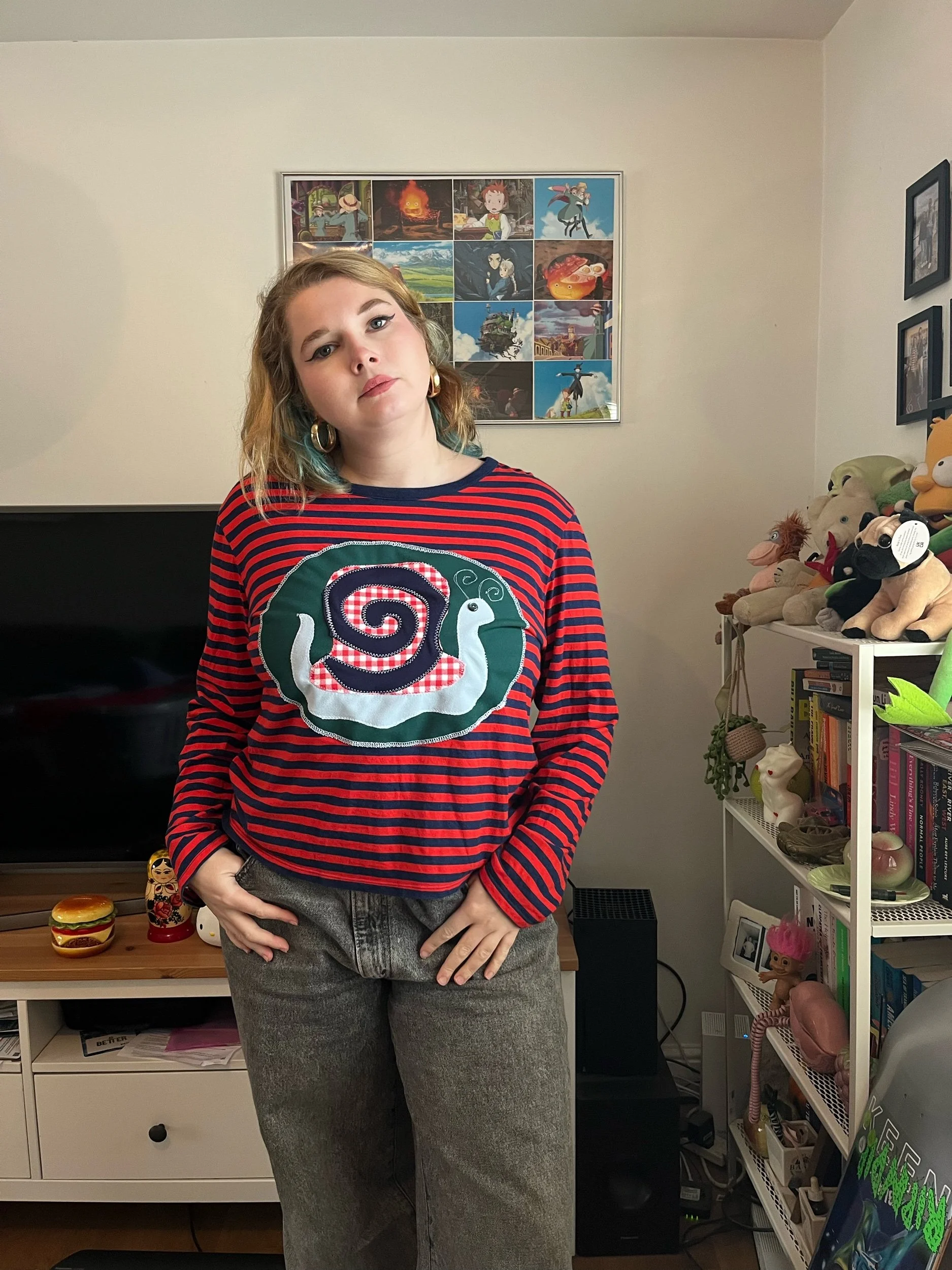 Made from a reworked long sleeve, the snail motif is constructed from scrap fabrics. Made from a mixture of cotton and stretch lycra.